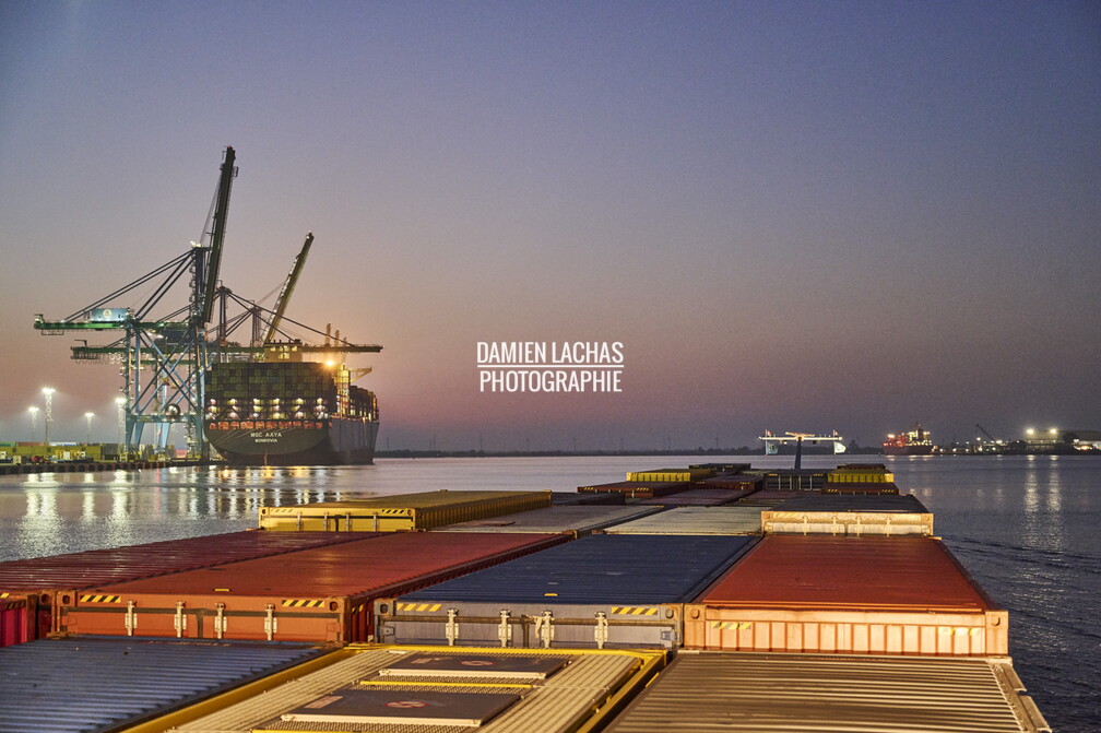 - Bassin Rhône-Saône, CMA-CGM, Département des Bouches-du-Rhône, entreprise, Europe, Filière Conteneurs, Fleuve, Fluvial, Fos-sur-Mer, France, Guadiana, infrastructure portuaire, Le Rhône, navigation fluviale, Navigation sur le Rhône à bord du Guadiana, Nuit, Péniche marchande, Port Fluvial, Port maritime, Port maritime de Marseille-Fos, porte-conteneur, portique portuaire, Région Provence-Alpes-Côte d'Azur, Transport fluvial, Transport maritime, Vallée du Rhône